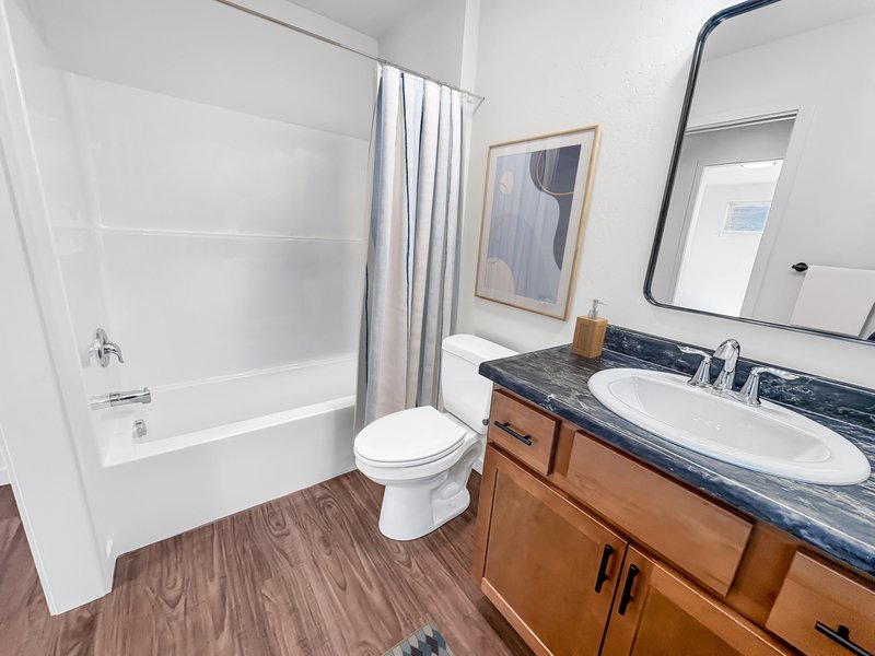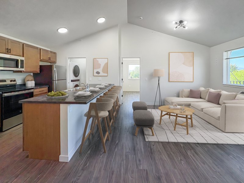 This beautiful apartment features luxury vinyl plank flooring, stainless steel appliances, air conditioning, washer and dryer, and storage units. Upper level units have balconies and vaulted ceilings. Lower floors have 9 foot ceilings for great reflection of natural light.