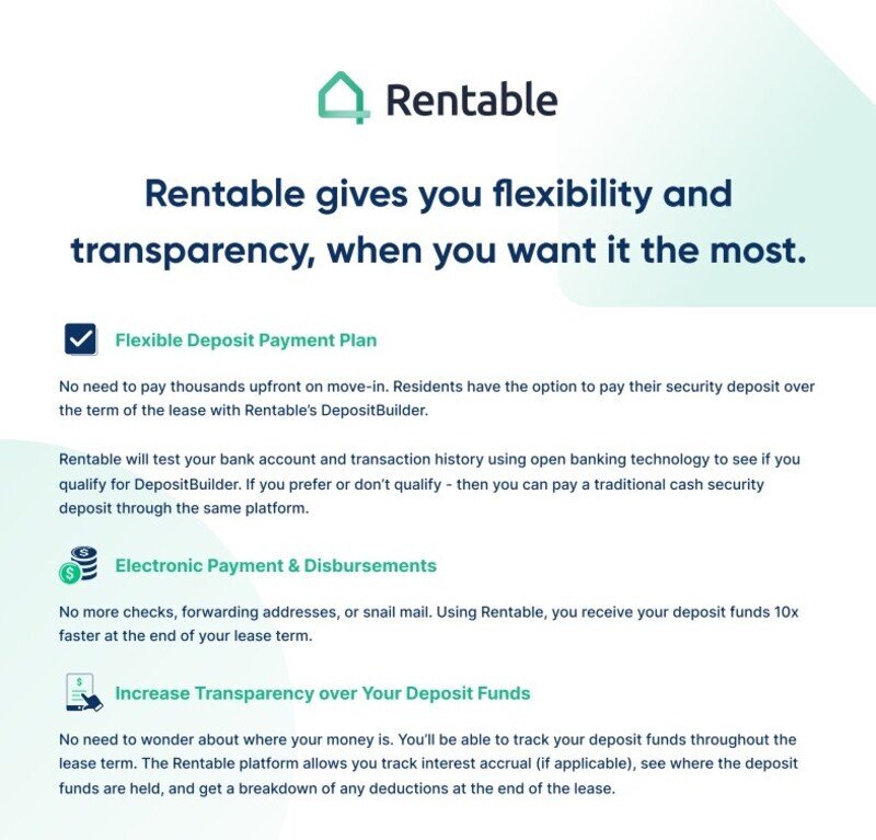 * Rentable charges a one time payment processing fee of 3% or $39.00. Additional fees may apply for the Security Deposit Payment Plan. Updates on our website with further information about Rentable are currently pending.