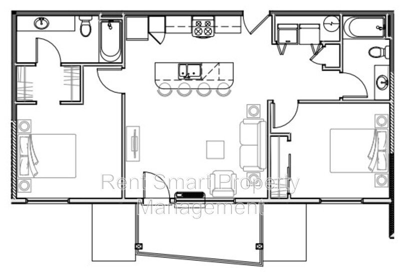 - 2 bedrooms, 2 full baths, separated by spacious living room and kitchen